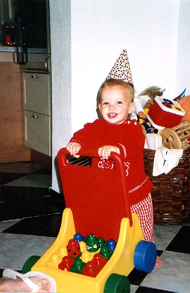 Hier zien jullie een foto gemaakt op mijn 1e verjaardag. Je ziet me met mijn favoriete speeltje, gekregen van Ome Roekie. Met dit mobiel scheur ik altijd achter Wouter, onze kat aan. | ||||||||||||||||||||||||||